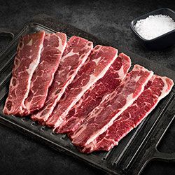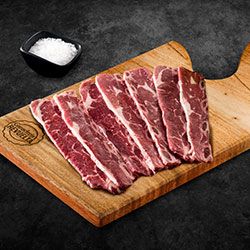 Un clásico de la parrilla, la costilla corta o short rib se caracteriza por su sabor intenso gracias a los pequeños huesos intermedios, muy fácil de asar debido a su corte delgado y textura suave, Calidad GANADERÍA REVUELTA.
